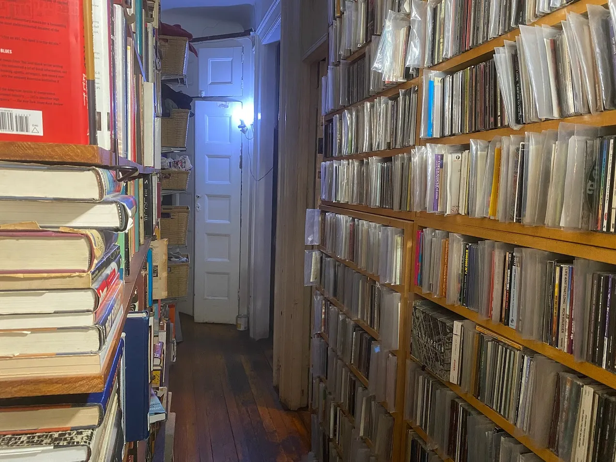 The steel 12-by-36 shelving units hold some 240 vinyl LPs per shelf. Some have been retrofitted for CDs. None of the seven rooms in the domicile we've occupied for half a century is anything like huge, but wrapped around most of them is a long hallway that takes a right at the bathroom and leads all the way from the front door to the corner living-room-plus-alcove where Carola works. The hallway is functionally an adjunct of a record library that includes not only a big chunk of my accumulated sound recordings but an additional 65 feet of CDs. So I feel kind of proud that--except for a special-ordered one-of-a-kind seven-by-three-and-a-half feat of carpentry, which supports 13 40-inch CD shelves that in turn accommodate all my A-list CDs alphabetized from Abba down to, well, Del-Lords--the hallway also accommodates, you know, books. Plus, well, having converted to CD circa 1991, I now also oversee 65 CD-ready shelves from 17 to 40 inches long tucked here, there, and everywhere. All are crammed with mostly jewelboxed compact discs that to save a little space I transfer into skinny flexible polyvinyl sleeves if they've proven marginal. And since Carola and I are writers who read a lot, there are also all the aforementioned, you know, books, which stretch through every room in the house for a total of something like 400 linear feet. And last as I calculate use value come a mere three file cabinets, 13 drawers spread over three units full of what I'll just call memorabilia--typescripts, drafts, bios, and press releases, some of them regarding artists lost to history, though as the archivally inclined tend to see it that only increases their historical import. And finally I'm obliged to leave my apartment behind as I unlock the five-by-10-by-10 storage unit over near Avenue D for which I've shelled out ever-increasing monthly rents for 30-40 years now. It's overrun with more vinyl LPs plus old reader mail and old press releases and old love letters and, absolutely, more books.